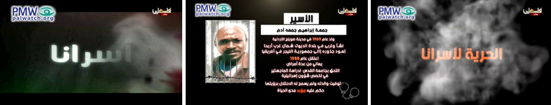 The short PA TV filler opens with the words ”Our Prisoners” on the screen, and ends with the words ”Freedom for our Prisoners.” In between, is the picture of the terrorist murderer with a short bio: