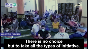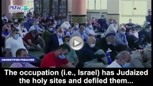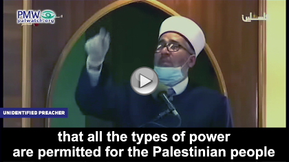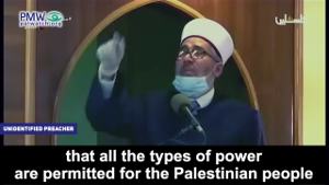 The preacher quoted the beginning of a Quran verse whose continuation calls for war to “terrify the enemy of Allah.” The verse, which is known to be a call for Jihad, used in the current context is clearly identifying Israelis as “the enemies of Allah” to be fought. The words quoted by the preacher implores Palestinians to use “all means of power” against Israel. The preacher stressed that now is not a time merely for “prayers” but a time to act: