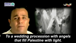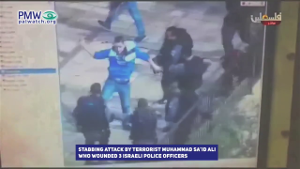 It also repeats something else. Part of the visuals in the music video is footage of a real stabbing attack. A Palestinian terrorist stabbed and wounded Israeli police officers near Damascus Gate in the Old City of Jerusalem in 2015 before he was killed and “became a Martyr.” The repeat broadcast of his attack is a reminder to Palestinians that carrying out terror attacks against Israelis is a good way to achieve Martyrdom for Allah: