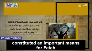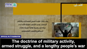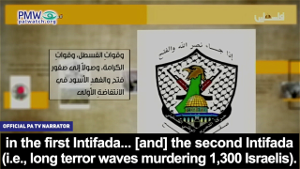 Official PA TV narrator: “[Fatah’s] military activity was expressed through operations (i.e., terror attacks) and armed struggle… in the first Intifada... [and] the second Intifada (i.e., long terror waves murdering 1,300 Israelis). The doctrine of military activity, armed struggle, and a lengthy people’s war constituted an important means for Fatah to mobilize the capabilities of the public and the Palestinian people.”