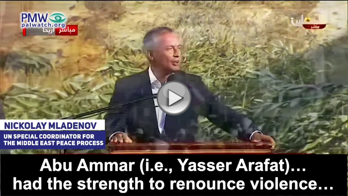 Speaking at a Fatah-organized rally in Jericho before an audience of both Palestinians and international representatives, Mladenov, in the name of the UN, adopted blatant Palestinian lies to the international community about Yasser Arafat renouncing violence, pandered to the myth of Palestinian “democracy”, and called for Palestinian unity that would include representatives of the internationally recognized terror organization Hamas and others.