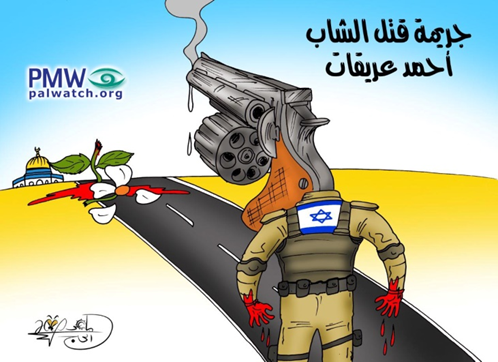 Text on cartoon: “The murder of young Ahmed Erekat”[Official Fatah Facebook page, June 25, 2020]
