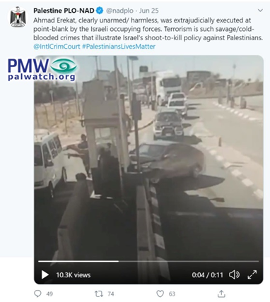 Tweeted text in English: “(All errors in source –Ed.) Ahmad Erekat, clearly unarmed/ harmless, was extrajudicially executed at point-blank by the Israeli occupying forces. Terrorism is such savage/cold-blooded crimes that illustrate Israel's shoot-to-kill policy against Palestinians.