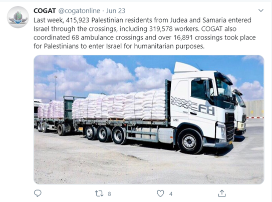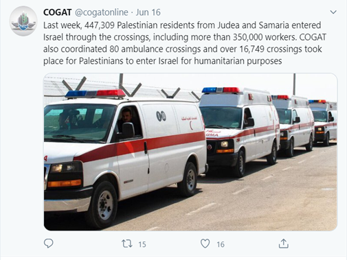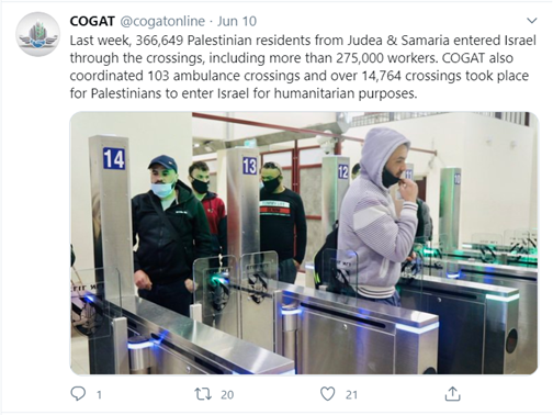 Secondly, statistics provided by the Israeli Coordinator for Government Activities in the Territories (COGAT) show that in June 2020 alone, there were over one million recorded crossings of Palestinians into Israel (as demarcated by the 1949 Armistice lines). Palestinians are crossing for work and medical treatment. If the PA believed that the spike in the number of Palestinians infected with the Coronavirus was the result of Palestinian contact with Israelis, surely the PA would have prohibited Palestinians from crossing the armistice line into Israel, which is something could have done at any time.