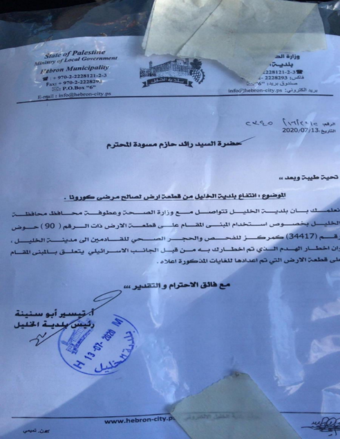 “We inform you that the Hebron Municipality is in contact with the Ministry of Health, and with the Honorable Governor of the Hebron District, regarding the use of the building located on the plot of land, numbered (90) No. Plot (34417) as a medical examination and isolation center for those coming to Hebron.”