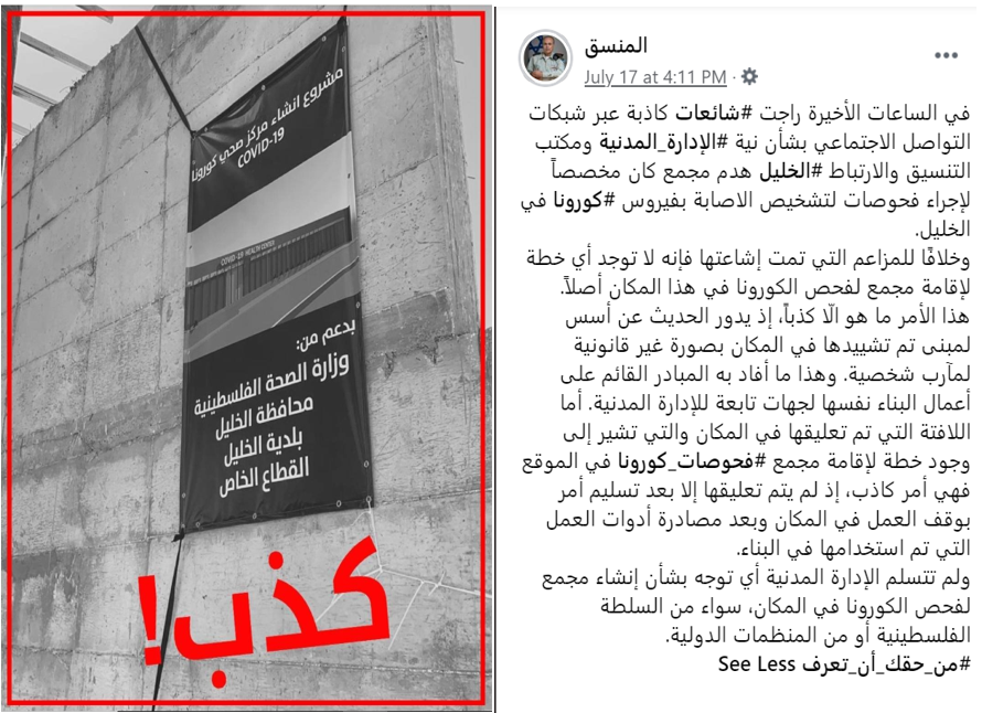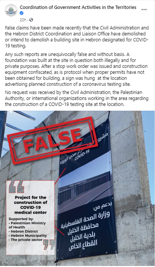 “False claims have been made recently that the Civil Administration and the Hebron District Coordination and Liaison Office have demolished or intend to demolish a building site in Hebron designated for COVID-19 testing.