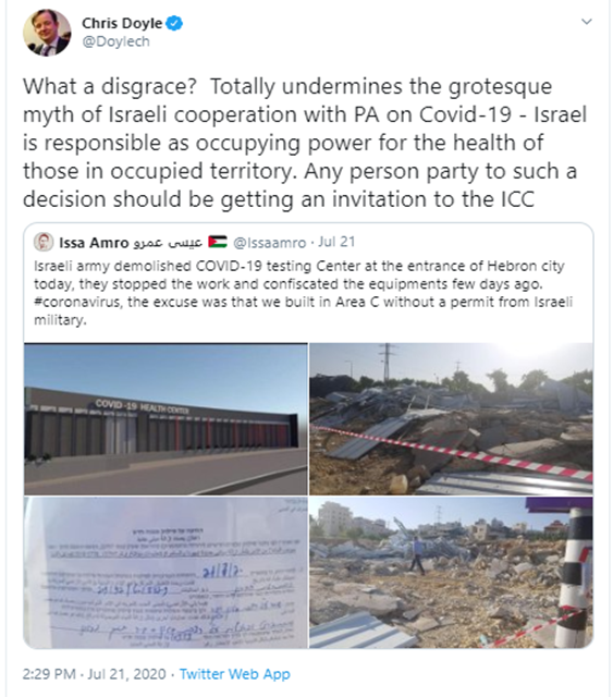 Chris Doyle, whose Twitter profile presents him as a “Commentator on Middle East, international politics and Director of @Caabu Council for Arab-British Understanding” was quick to adopt and amplify the lies of Amro. Dolye, based merely on the false libel, was even quick to suggest that those responsible for such an egregious action, should be prosecuted in the International Criminal Court.