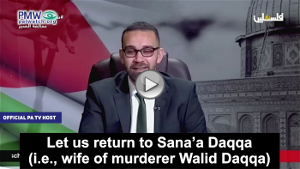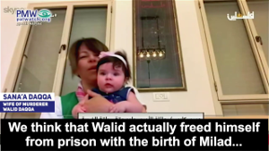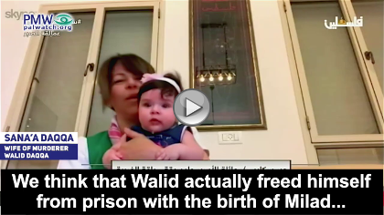 At the time, the reporter from official PA TV who interviewed the murderer’s wife complained that the imprisoned terrorist had not been allowed a visit in prison by his newborn daughter. PA TV decided to remedy this and make sure murderer Daqqa saw his daughter Milad - at least on TV. Interviewed on PA TV, the terrorist’s wife Sana’a Daqqa, stated that by Milad’s birth her murderer husband had “freed himself from prison”: