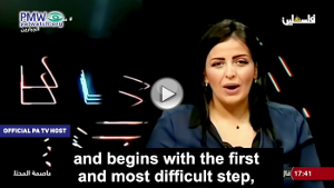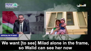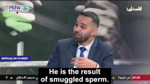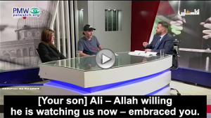 Official PA TV host: “[Your son] Ali – Allah willing he is watching us now – embraced you. He is the result of smuggled sperm. Let us look at Ali, when you left the prisons… This is the moment that our prisoners are now watching: Your embrace with Ali who is the result of sperm smuggling and who is now 5 years old.”