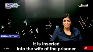 Official PA TV host: “Our topic today is slightly odd, making one sad and happy at the same time: Smuggled sperm, which passes through strange stations and begins with the first and most difficult step, which is the smuggling of this sperm out of the prison... Then the occupation checkpoints - checkpoint after checkpoint - and the sperm travels through cities and villages until it reaches the medical clinic that specializes in insemination. It is inserted into the wife of the prisoner who smuggled the sperm over the [prison] fence to create a pregnancy. The wife of the heroic prisoner carries in her womb the child of tomorrow, one of Palestine’s hopes.”