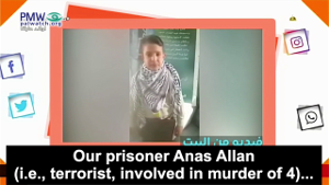 On a PA TV show for kids, O Children of Our Neighborhood, two such home videos were broadcast, showing very young kids addressing terrorists as the “heroic prisoners.” Holding a framed poster of terrorist Anas Allan who is serving 4 life sentences for transporting a suicide bomber who murdered 4 Israelis, two girls likened the imprisoned terrorists to “tall mountains” and “lions.” A young boy specifically mentioned murderer Allan, sending “love” to all prisoners: