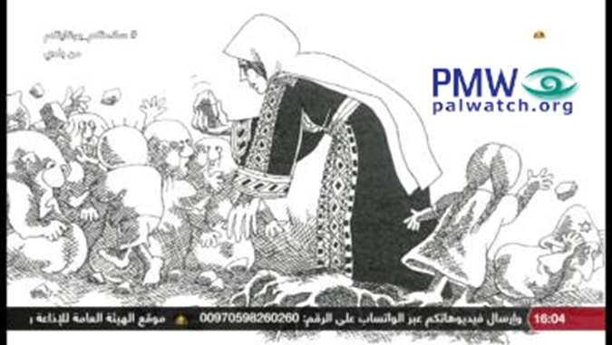 Official PA TV narrator girl: “Naji [Al-Ali] invented the character of Handala, who was in his drawings regularly and represents a 10-year-old boy who turns his back to the viewers… Naji had another character who returned again and again in his drawings as the figure of the Palestinian woman, whom Naji called Fatima. She is a character who is not humiliated. Her vision is very clear on everything regarding the cause and the way to resolve it.”