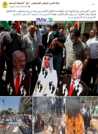 Picturing a masked rioter alongside a deformed caricature of US President Donald Trump and pictures of UAE Crown Prince Mohammed bin Zayed Al Nahyan and Israeli Prime Minister Benjamin Netanyahu, another Fatah Facebook post called to reject the agreement of shame and treason with the Zionist enemy: