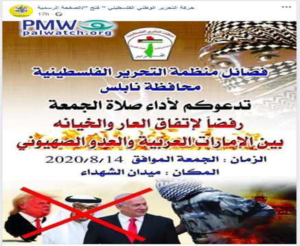 “The PLO factions in the Nablus district call on you to hold the Friday prayers as a sign of rejection of the agreement of shame and treason between the UAE and the Zionist enemy”