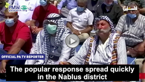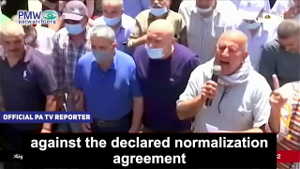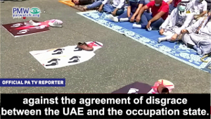 Official PA TV reporter: “The popular response spread quickly in the Nablus district against the agreement of disgrace between the UAE and the occupation state. Hundreds of the district’s residents who are furious over the UAE’s knife in the back held Friday prayers at the Al-Shuhada Square in the center of Nablus. Following [the prayers] came a procession against as a sign of rejecting the declared normalization agreement that comes to serve the blazing American-Israeli war against the Palestinian principles.”