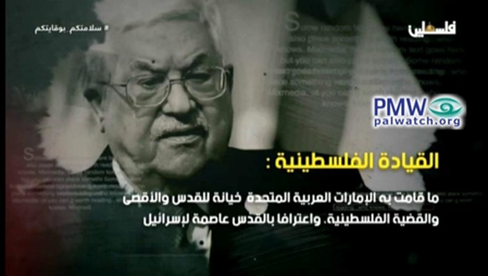 Text on screen: “The Palestinian leadership: ‘What the UAE did is a betrayal of Jerusalem, the Al-Aqsa Mosque, and the Palestinian cause, and recognition of Jerusalem as Israel’s capital.’”