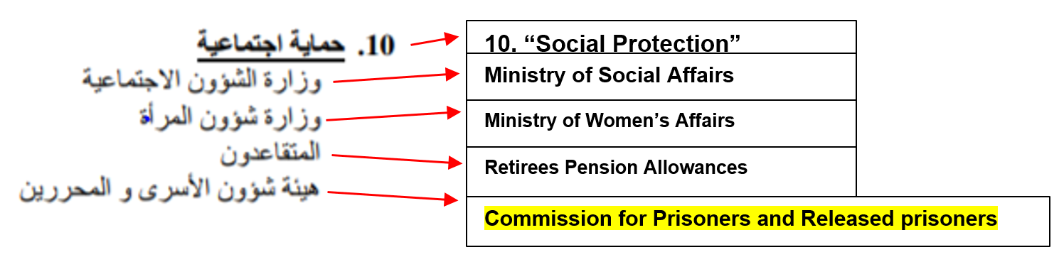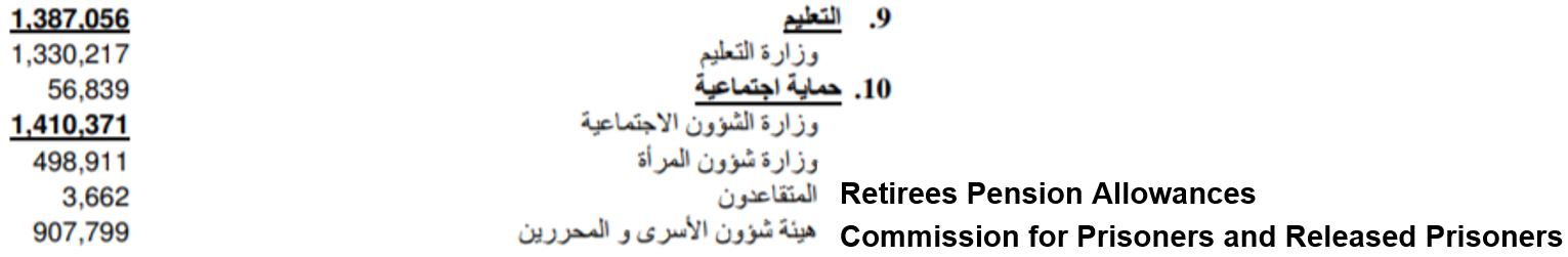 As a result, all the correct budget numbers are only in the English (right column) whereas in the Arabic (left) only the first two figures are correct and all the others are misaligned. The PA then added the words on the bottom left “Commission for Prisoners and Released Prisoners” (no color) opposite the figure 907 million which is, infact, really for Retirees Pensions.