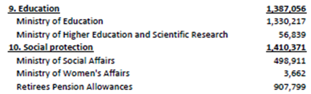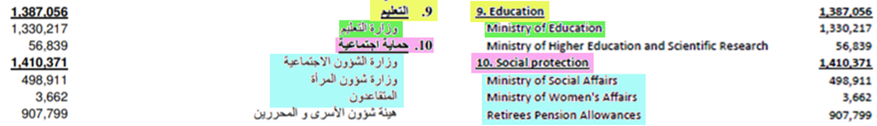 In the English under the category “9. Education” (see yellow on right) there are two subcategories: the Ministry of Education (green) 1.3 billion and Ministry of Higher Education (no color) 56 million. However, in the Arabic under the category “9. Education” there is only one subcategory: the Ministry of Education (green, left) 1.3 billion. The words “Ministry of Higher Education” are missing but its budget row of 56 million is still there (see pink) but now incorrectly lining up with “10. Social protection.”
