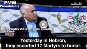But it isn’t necessary to search for such statements in the past. Rajoub continues to reiterate his support for violence and murder of Israelis. Earlier this year, he mentioned several murderers by name, calling their attacks “glorious acts that teach generations”: