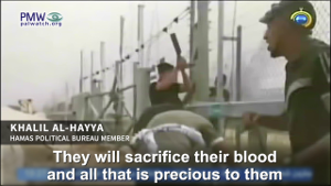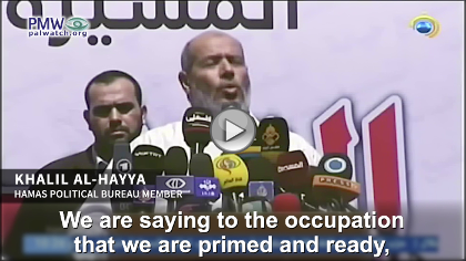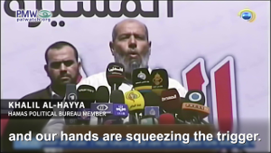 Hamas Political Bureau member Khalil Al-Hayya: “We are saying to the occupation that we are primed and ready, and our hands are squeezing the trigger. We’re not afraid of threats or hints about an attack here or killings or bombings. Know that bombings will be answered with bombings. Rockets will be answered with rockets. Casualties will be answered with casualties! Palestine – its people lives! And it has fortunate heroic men. They will sacrifice their blood and all that is precious to them in defense of their land, defense of their Jerusalem, defense of their heritage, and defense of their present and future!”