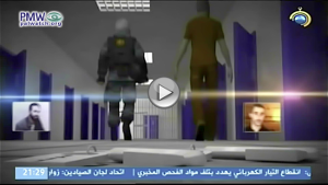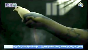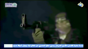 The message that only violence and terror will free Palestinian prisoners also appeared in another filler between programs. A Hamas fighter loads bullets into an ammunition magazine and shoots at a hand with an Israeli flag. The Israeli hand is squeezing a white dove symbolizing the “peace seeking” Palestinian prisoners – i.e., imprisoned terrorists. As the Hamas fighter shoots the Israeli, the dove is set free.