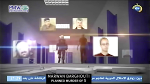 Another animation showed the hand of someone attempting to open a prison cell door with various keys. The first key labeled “[UN] Security Council” can’t open the door, and neither can the second key labeled “negotiations.” Then a hand of a Hamas fighter with a black sleeve and black fingerless tactical gloves with a key labeled “resistance” succeeds in opening the door and freeing the prisoner inside. As the prisoner and the Hamas fighter walk towards the prison exit, pictures of various imprisoned terrorist murderers appear on the screen is if they are being released from prison: Abdallah Barghouti (built bombs that murdered 67), Abbas Al-Sayid (planned suicide bombings murdering 35), Marwan Barghouti planned murders of at least 5), Ahmad Sa'adat (head of PFLP terror organization), and Karim Younes (murdered Israeli soldier). [Al-Aqsa TV (Hamas), Aug. 23, 2020