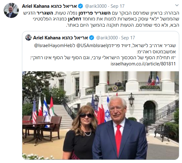Initially, the interview (published close to midnight Sept. 16, 2020) in the Israeli daily ran a typo in Ambassador Friedman’s response to a question about whether the US is considering appointing former Fatah leader Muhammad Dahlan, who lives in the UAE, as the next Palestinian leader. The corrected article (Sept. 17, 2020) reads:
