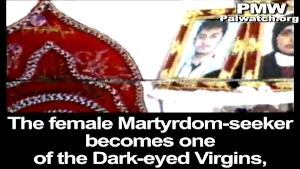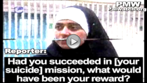 Palestinian Media Watch documented a similar response in 2004 when another female suicide bomber was caught. She stated that her “reward would have been from Allah” and that she would have become one of the 72 “Dark-Eyed Virgins” in Paradise who marry the male Martyrs: