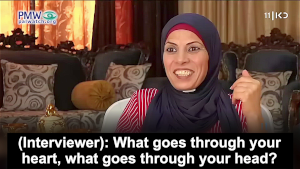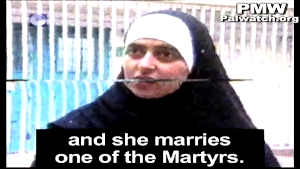 Her attitude and belief that she was on her way to marry a male Martyr in Heaven, and the fact that she still recalls that feeling fondly today, proves the success of the PA’s brainwashing of Palestinians into believing that carrying out a terror attack and dying for “Palestine” will award them a wedding in Paradise.
