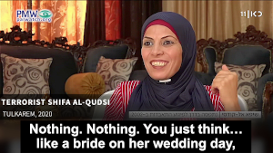 Today she still recalls her thoughts and feelings while getting ready for the attack. In an interview on Israeli TV last month, Al-Qudsi remembered how she felt joyous while preparing to murder Israelis: “Like a bride on her wedding day, who is preparing to go to her groom.”