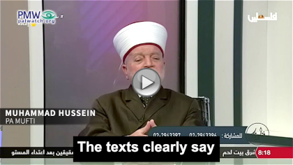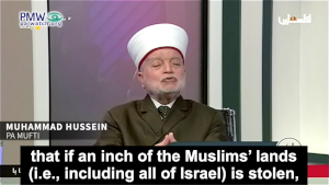 PA Mufti Muhammad Hussein: “The land of Palestine is waqf (inalienable religious endowment in Islamic law). It must not be relinquished nor must any part of it be sold... It is the duty of the leaders of the [Islamic] nation and its peoples to liberate Palestine (i.e., all of Israel) and Jerusalem, to prevent the Judaization in it."