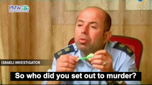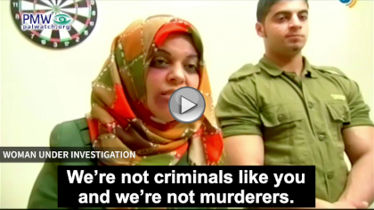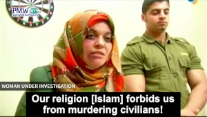 In a scene on the show Self-Sacrificing Fighter (Fida’i), which was produced by Hamas’ Al-Aqsa TV and rebroadcast recently, an armed terrorist enters a restaurant in Tel Aviv and shoots and murders Israeli/Jewish diners. Following the attack, a Palestinian woman is being interrogated by an Israeli investigator. She explains that while Islam forbids murdering civilians, killing Israelis/Jews is justified because Israelis/Jews are all “criminals”: