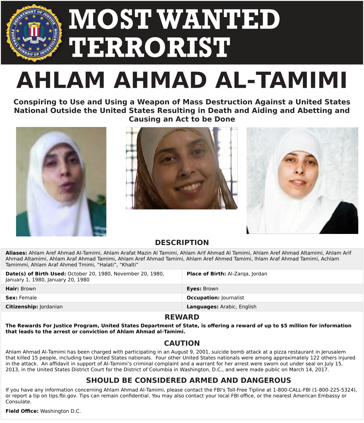 - In 2018, the US State Department announced a $5 million prize under its “Rewards for Justice” program for information leading to Tamimi’s arrest or conviction. But she has never been in hiding, not even for a day. She doesn’t need to be because the Kingdom of Jordan is quietly and effectively keeping her free and safe.