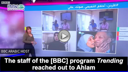 The BBC host told viewers that Tamimi is “back” in the headlines, skipped or twisted the important background details about Tamimi’s murderous terror, and then described how she phoned in to a popular Amman-based radio station and tried to appeal directly to King Abdullah II to intervene and return her husband to Jordan.