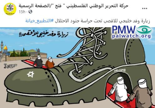 Fatah also posted this cartoon mocking the visitors from the UAE and Bahrain to the Al-Aqsa Mosque who entered through Israel: