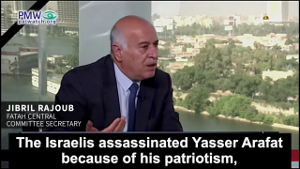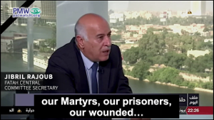 Fatah Central Committee Secretary Jibril Rajoub: “In the shade of the Palestinian flag… we will all take refuge… draw nearer to one another, to think, eat, drink, sing, and live our lives as Palestinians, through the pride and glory of our people’s sacrifices – our Martyrs, our prisoners, our wounded… The Israelis assassinated Yasser Arafat because of his patriotism, and so too regarding Sheikh Ahmed Yassin (founder of Hamas responsible for murder of hundreds), and Abu Ali Mustafa (Secretary-General of PFLP terror org., responsible for many murders). They are giants. We must be loyal to this heritage. And also [to] those who are still in prison, and foremost among them Karim Younes… Maher Younes (murdered 1 together), Ahmad Sa’adat (leader of PFLP terror org., responsible for many murders), and Marwan Barghouti (convicted of murder of 5)… We have 6,000 giants inside the prisons whose names I cannot mention, but each one of them is a legend, each one of them is an ethos.”
