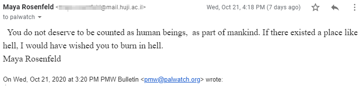 A lecturer who teaches at Hebrew University responded to a recent PMW report with the following curse sent by email: