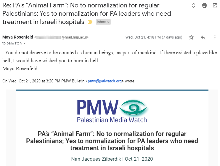 The curse was sent to Palestinian Media Watch by Dr. Maya Rosenfeld from her Hebrew University email address.