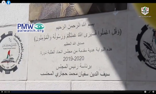 In the latest proof of this, the Student Union Council at Palestine Polytechnic University in Hebron gifted the institution with the gate seen in the photo above, named after Salah Khalaf “Abu Iyad” – the terrorist who headed the Black September terror organization and planned the Munich Olympics massacre, in which 11 Israeli athletes were murdered in 1972.