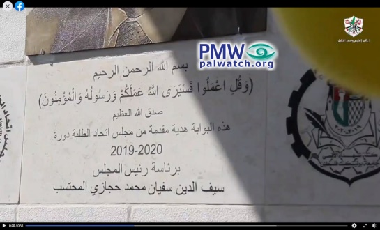During the inauguration ceremony, the chairman of the Student Union Council Saif Al-Muhtasib stated that the students are “proud” of the terrorist leader: