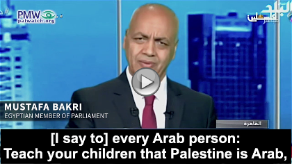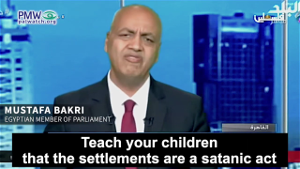 Egyptian MP and official PA TV host Mustafa Bakri: “[I say to] every Arab person: Teach your children that Palestine is Arab, that Jerusalem is Arab, and that the enemy who occupied this land will not be able to continue doing so. Teach your children that the settlements are a satanic act whose fundamental goal is to destroy the land and take control of it… Teach your children that regardless of what happens, the Zionist entity will come to an end.”