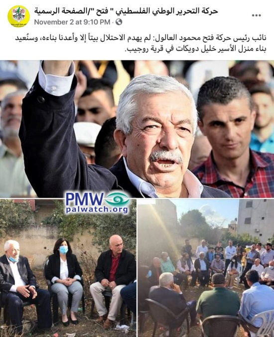 Posted text: “Fatah Movement Deputy Chairman Mahmoud Al-Aloul: ‘There is no home that the occupation has destroyed and we have not rebuilt. We will rebuild the home of prisoner Khalil Dweikat (i.e., terrorist, murdered 1) in the village of Rujeib.”