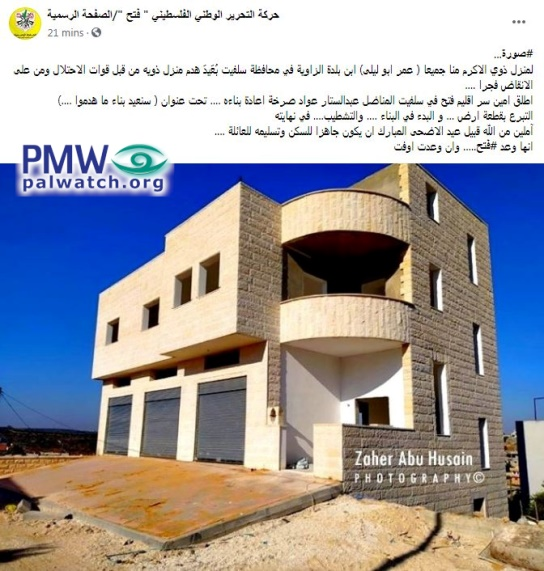 Murderer’s father’s posted text: “Many thanks to [Fatah’s] Salfit Branch Secretary brother Abd Al-Sattar Awwad ‘Abu Iyad’ for his continuous overseeing and monitoring of the construction of our home, and for his standing with the Martyrs’ families. We thank all those who took part in constructing this home.”