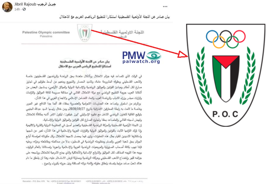The Palestine Olympic Committee… expresses its strong condemnation of these steps, and views them as encouraging the occupation with all its elements so that it will continue the most despicable crimes against our Arab and Muslim people and against the sports system in Palestine, and this is instead of putting it on trial, boycotting it, and isolating it.”[Facebook page of Chairman of the Palestine Olympic Committee Jibril Rajoub, Nov. 1, 2020]