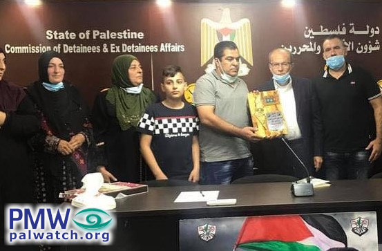 The image shows Director of PLO Commission of Prisoners’ Affairs Qadri Abu Bakr holding an honorary plaque featuring the PA map of “Palestine” that presents all of Israel (together with the PA areas) as “Palestine”.