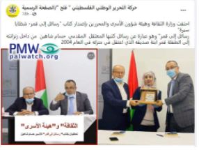 Posted text: “The [PA] Ministry of Culture and the [PLO] Commission of Prisoners and Released Prisoners’ Affairs celebrated the publication of the book ‘Letters to Qamar – Shards of Biography,’ which is a collection of letters written by Jerusalem resident and prisoner Husam Shahin (i.e., terrorist and member of the Al-Aqsa Martyrs' Brigades, serving 27 years) from his cell to the young girl Qamar, his friend’s daughter.”