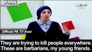 Official PA TV children’s host Walaa Al-Battat:"The occupation [Israel] targets children everywhere. In their schools, near their homes... We must be very careful now. We are confronting the occupiers who act in a very barbaric terrorist way. They are trying to kill people everywhere. These are barbarians, my young friends. They try to kill people for no reason, who are just walking on their land. They make various accusations against them. This is called barbarity, my friends. Be very careful all the time. All children under 18, and children under 15, when you go out, your mom or dad, should accompany you, I mean that an adult should accompany you."