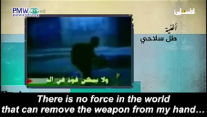 One such means is songs. One song in particular stresses the fact that the Palestinians have and will never abandon violence: My Weapon Has Emerged. The repeating refrain declares: “There is no force in the world that can remove the weapon from my hand.”