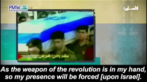 In a quiz on Palestinian musical history, the PA currently presents this song as one of the Palestinian national songs that “express our national identity,“ and “fascinate us with values and meanings.” Significantly, not only the words celebrate the use of violence, so do the visuals PA TV added. While the song is playing, footage is shown of masked Palestinians carrying weapons, attacking, and shooting. To leave no doubt who this violence is aimed at and that murderous terror is the goal, an image from an Israeli funeral has been inserted, showing soldiers carrying a coffin draped in an Israeli flag: