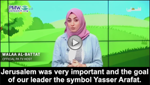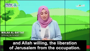 Official PA TV host Walaa Al-Battat: "Jerusalem was very important and the goal of our leader the symbol Yasser Arafat. The children declare with the [previous] song their insistence on their presence on their presence in Jerusalem, the restoration of all Jerusalem, and Allah willing, the liberation of Jerusalem from the occupation. Allah willing, one day, my children friends, our entire land will return to us… Allah willing we are continuing on the same path [of Arafat], my friends, until we restore our land."
